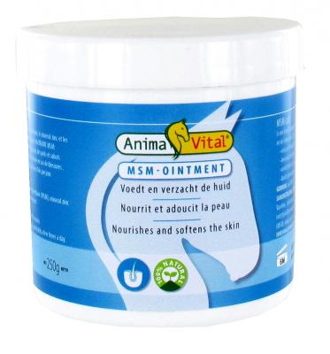 MSM-zalf van ANIMAVITAL is een breed toepasbare zalf op basis van de organische zwavelmolecule methylsulfonylmethaan (MSM), het mineraal zink en de vitaminen E (uit tarwekiemolie) en A (uit wortelolie). Regelmatig aanbrengen van de MSM-ZALF: